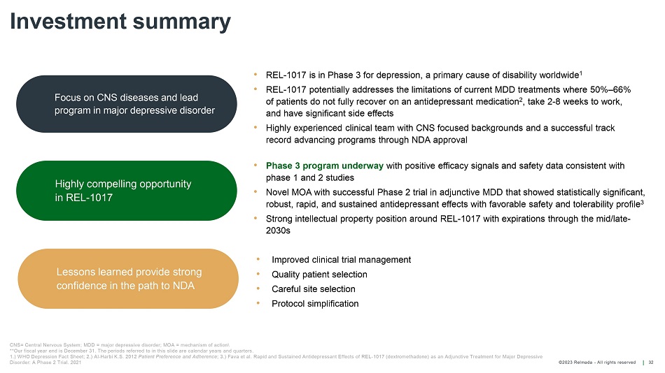 ©202 3 Relmada - All rights reserve d Relmada development program & timeline 31 Program 1Q 23 2Q 23 3Q 23 4Q 23 1H 24 2H 24 REL - 1017 • Concluded Reliance - OLS with data coming in 2023 • Complete ongoing Reliance II 1H 2024 • Initiating additional phase 3 adjunctive MDD trial mid - 2023 with completion anticipated 2H 2024 Upcoming events Reliance II (302): adjunctive MDD trial Reliance OLS: long - term, open - label study in MDD Study 304: adjunctive MDD trial
