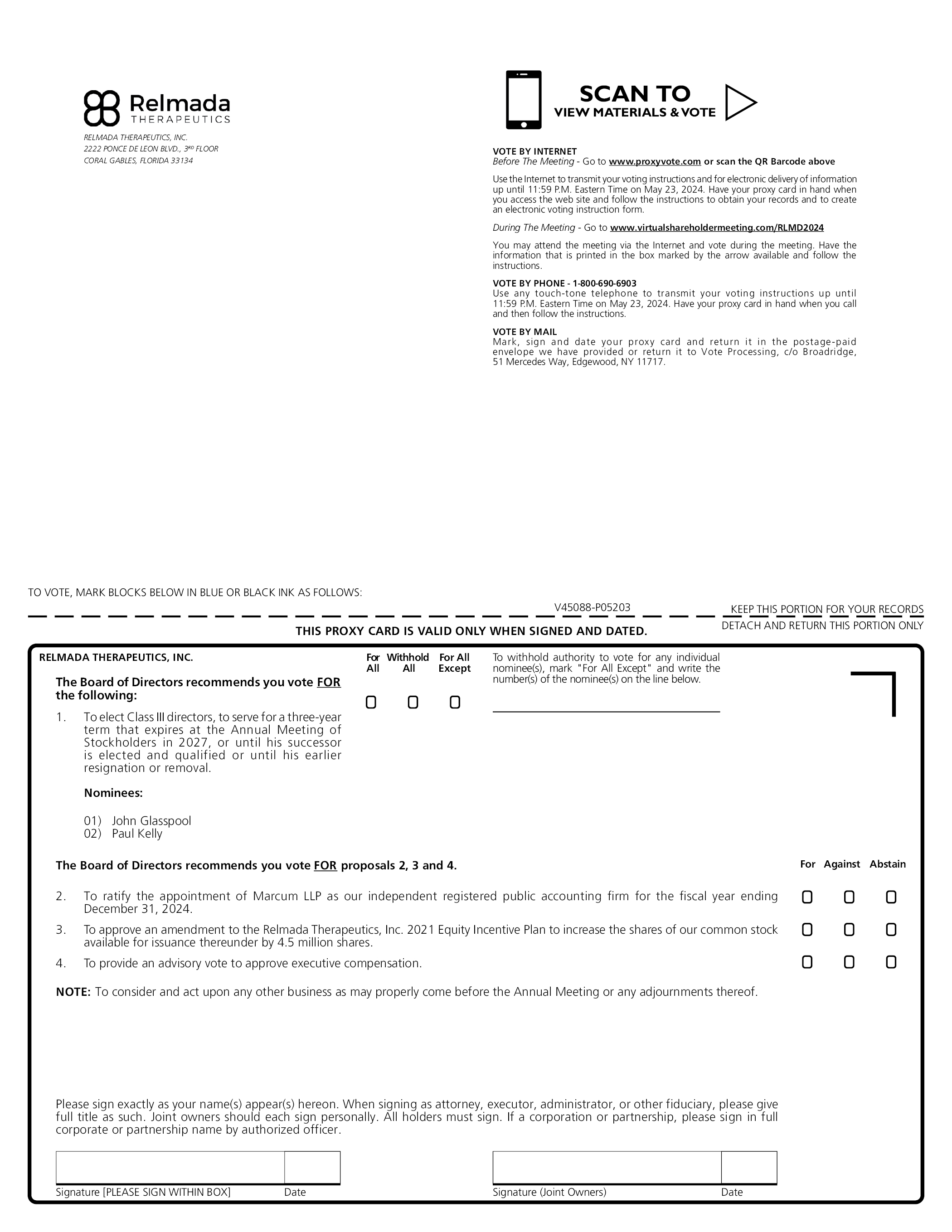 SCAN TO VIEW MATERIALS & VOTE RELMADA THERAPEUTICS, INC. 2222 PONCE DE LEON BLVD., 3RD FLOOR CORAL GABLES, FLORIDA 33134 VOTE BY INTERNET Before The Meeting - Go to www.proxyvote.com or scan the QR Barcode above Use the Internet to transmit your voting instructions and for electronic delivery of information up until 11:59 P.M. Eastern Time on May 23, 2024. Have your proxy card in hand when you access the web site and follow the instructions to obtain your records and to create an electronic voting instruction form. During The Meeting - Go to www.virtualshareholdermeeting.com/RLMD2024 You may attend the meeting via the Internet and vote during the meeting. Have the information that is printed in the box marked by the arrow available and follow the instructions. VOTE BY PHONE - 1-800-690-6903 Use any touch-tone telephone to transmit your voting instructions up until 11:59 P.M. Eastern Time on May 23, 2024. Have your proxy card in hand when you call and then follow the instructions. VOTE BY MAIL Mark, sign and date your proxy card and return it in the postage-paid envelope we have provided or return it to Vote Processing, c/o Broadridge, 51 Mercedes Way, Edgewood, NY 11717. TO VOTE, MARK BLOCKS BELOW IN BLUE OR BLACK INK AS FOLLOWS: V45088-P05203 KEEP THIS PORTION FOR YOUR RECORDS THIS PROXY CARD IS VALID ONLY WHEN SIGNED AND DATED. DETACH AND RETURN THIS PORTION ONLY RELMADA THERAPEUTICS, INC. For Withhold For All To withhold authority to vote for any individual The Board of Directors recommends you vote FOR All All Except nominee(s), mark “For All Except” and write the number(s) of the nominee(s) on the line below. the following: 1. To elect Class III directors, to serve for a three-year term that expires at the Annual Meeting of Stockholders in 2027, or until his successor is elected and qualified or until his earlier resignation or removal. Nominees: 01) John Glasspool 02) Paul Kelly The Board of Directors recommends you vote FOR proposals 2, 3 and 4. For Against Abstain 2. To ratify the appointment of Marcum LLP as our independent registered public accounting firm for the fiscal year ending December 31, 2024. 3. To approve an amendment to the Relmada Therapeutics, Inc. 2021 Equity Incentive Plan to increase the shares of our common stock available for issuance thereunder by 4.5 million shares. 4. To provide an advisory vote to approve executive compensation. NOTE: To consider and act upon any other business as may properly come before the Annual Meeting or any adjournments thereof. Please sign exactly as your name(s) appear(s) hereon. When signing as attorney, executor, administrator, or other fiduciary, please give full title as such. Joint owners should each sign personally. All holders must sign. If a corporation or partnership, please sign in full corporate or partnership name by authorized officer. Signature [PLEASE SIGN WITHIN BOX] Date Signature (Joint Owners) Date