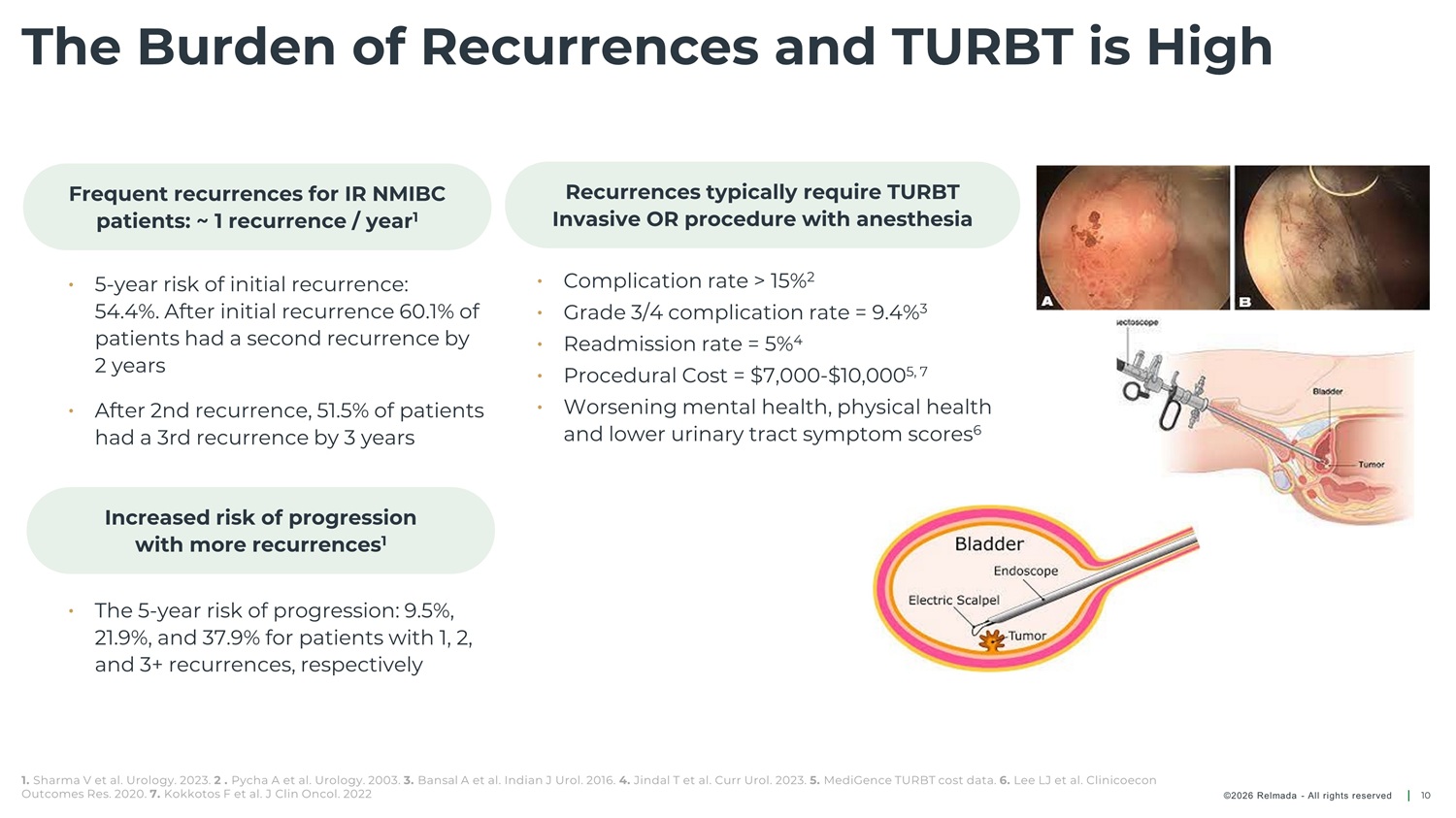The Burden of Recurrences and TURBT is High Frequent recurrences for IR NMIBC patients: ~ 1 recurrence / year 1 Recurrences typically require TURBT Invasive OR procedure with anesthesia • Complication rate > 15% 2 • 5 - year risk of initial recurrence: 54.4%. After initial recurrence 60.1% of patients had a second recurrence by 2 years • Grade 3/4 complication rate = 9.4% 3 • Readmission rate = 5% 4 • Procedural Cost = $7,000 - $10,000 5, 7 • Worsening mental health, physical health and lower urinary tract symptom scores 6 • After 2nd recurrence, 51.5% of patients had a 3rd recurrence by 3 years Increased risk of progression with more recurrences 1 • The 5 - year risk of progression: 9.5%, 21.9%, and 37.9% for patients with 1, 2, and 3+ recurrences, respectively 1. Sharma V et al. Urology. 2023. 2 . Pycha A et al. Urology. 2003. 3. Bansal A et al. Indian J Urol. 2016. 4. Jindal T et al. Curr Urol. 2023. 5. MediGence TURBT cost data. 6. Lee LJ et al. Clinicoecon Outcomes Res. 2020. 7. Kokkotos F et al. J Clin Oncol. 2022 ©2026 Relmada - All rights reserved 10