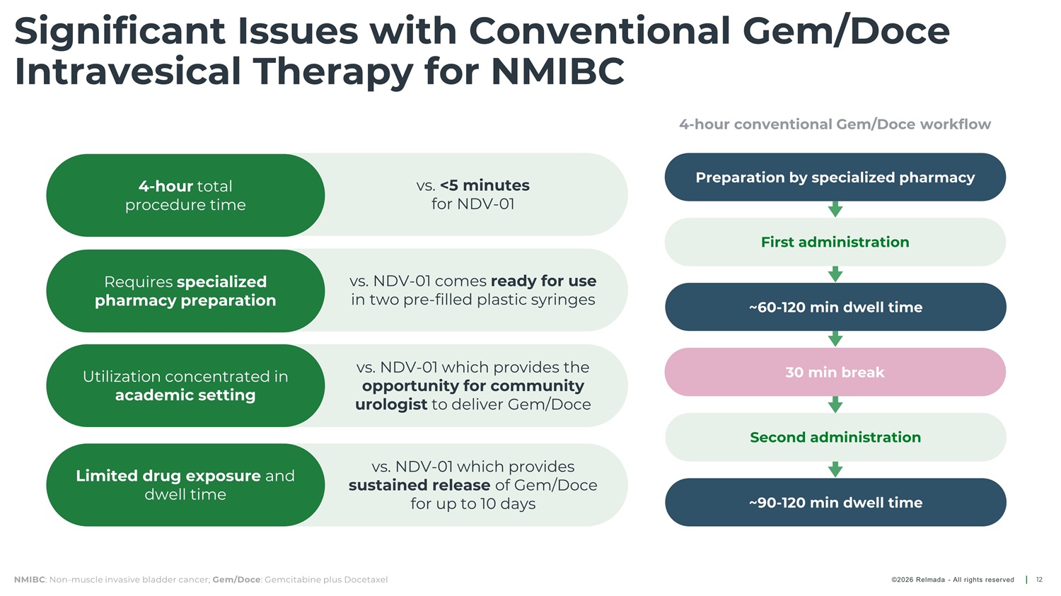 Significant Issues with Conventional Gem/Doce Intravesical Therapy for NMIBC Preparation by specialized pharmacy First administration 4 - hour total procedure time vs. <5 minutes for NDV - 01 Requires specialized pharmacy preparation vs. NDV - 01 comes ready for use in two pre - filled plastic syringes ~60 - 120 min dwell time 30 min break vs. NDV - 01 which provides the opportunity for community urologist to deliver Gem/Doce Utilization concentrated in academic setting Second administration ~90 - 120 min dwell time vs. NDV - 01 which provides sustained release of Gem/Doce for up to 10 days Limited drug exposure and dwell time NMIBC : Non - muscle invasive bladder cancer; Gem/Doce : Gemcitabine plus Docetaxel 12 ©2026 Relmada - All rights reserved