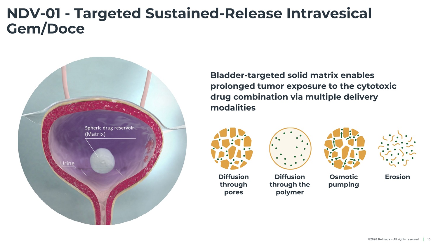 NDV - 01 - Targeted Sustained - Release Intravesical Gem/Doce Bladder - targeted solid matrix enables prolonged tumor exposure to the cytotoxic drug combination via multiple delivery modalities Diffusion through pores Diffusion through the polymer Osmotic pumping Erosion ©2026 Relmada - All rights reserved 13