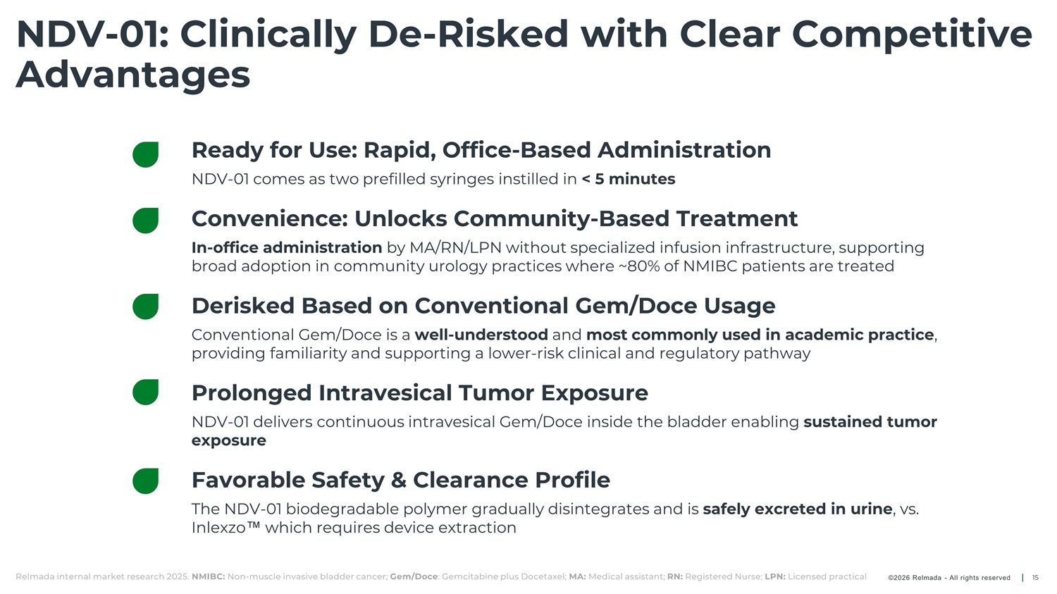 NDV - 01 in - vitro Drug Concentrations Show Continuous & Optimized Drug Release NDV - 01 Gem/Doce Concentration Over Time NDV - 01 Cumulative Release Profile 3000 30 25 20 15 10 5 100 90 80 70 60 50 40 30 20 10 Gem, µg/ml DCTX, µg/ml 2500 2000 1500 1000 500 0 Gemcitabine Release % Docetaxel Release % 0 0 0 20 40 60 80 100 120 140 160 180 200 0 20 40 60 80 100 120 140 160 180 200 Time (hours) Time (hours) • In - vitro profiles demonstrate stable and predictable drug levels, minimizing peaks and troughs associated with systemic side effects. • Controlled drug exposure can potentially enhance anti - tumor activity while reducing the frequency of administration, enabling biweekly dosing. Experimental overview: 12g NDV - 01 with 10% gemcitabine, 0.25% docetaxel formulation was instilled into 10ml artificial urine (AUF) and kept in an orbital shaker incubator at 370C, 20 rpm. The AUF sample was withdrawn twice a day and replaced by fresh AUF. The drugs concertation in the UAF was quantitatively determined by HPLC ©2026 Relmada - All rights reserved 14