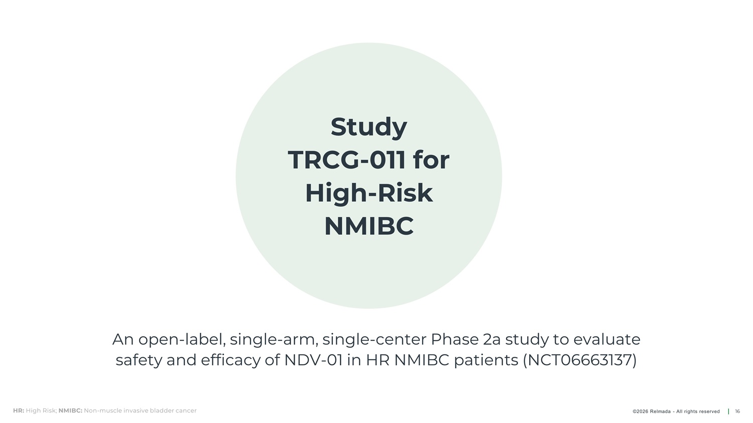 Study TRCG - 011 for High - Risk NMIBC An open - label, single - arm, single - center Phase 2a study to evaluate safety and efficacy of NDV - 01 in HR NMIBC patients (NCT06663137) HR: High Risk; NMIBC: Non - muscle invasive bladder cancer ©2026 Relmada - All rights reserved 16