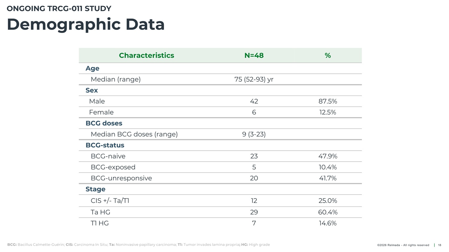 ONGOING TRCG - 011 STUDY Study Design Inclusion Criteria Primary Endpoint Secondary Endpoint Exploratory Purpose • High - risk disease with Evaluate the potential of NDV - 01 as a safe and effective treatment for patients with high - risk NMIBC • Safety • DOR • PK CIS, Ta/T 1 tumors 1, 2 • CR Rate at 12 months • EFS • BCG - naive, BCG - unresponsive, intolerant and experienced patients Intravesical NDV - 01 Follow up to 24 months Induction 6 biweekly instillations N=70 Urinary cytology Cystoscopy Upper tract imaging High - risk NMIBC Maintenance Monthly instillations TURBT or bladder biopsy if necessary 1. The American Cancer Society. Bladder Cancer Stages. American Cancer Society, 12, Mar, 2024; 2. Holzbeierlein, Jeffrey M., et al. “Diagnosis and Treatment of Non - Muscle Invasive Bladder Cancer: AUA/SUO Guideline: 2024 Amendment.” The Journal of Urology, vol. 211, no. 4, Jan. 2024. CIS : Carcinoma In Situ; Ta : Noninvasive papillary carcinoma; T1: Tumor invades lamina propria; NMIBC: Non - muscle invasive bladder cancer; CR: Complete Response; DOR: Duration of Response; EFS: Event Free Survival; PK: Pharmacokinetics; TURBT: Transurethral resection of bladder tumor BCG: Bacillus Calmette - Guérin ©2026 Relmada - All rights reserved 17