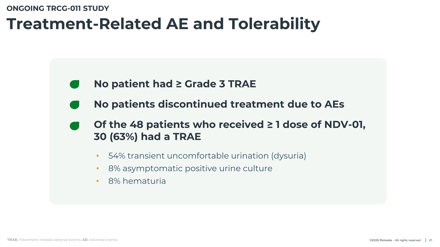 ONGOING TRCG - 011 STUDY Efficacy and Tolerability Efficacy Evaluable Patients 1 (Complete Response) BCG - UR Subpopulation (Complete Response) n/N 36/38 33/38 25/29 22/26 19/25 - % n/N 16/17 14/17 12/14 10/11 8/10 - % Anytime 95% 87% 86% 85%* 76%* 83% Anytime 94% 82% 86% 91% 80% 84% 3 - month 3 - month 6 - month 6 - month 9 - month 9 - month 12 - month 12 - month 12 - month KM analysis 12 - month KM analysis • • • No patient had progression to muscle invasive disease No patient underwent a radical cystectomy 10 patients awaiting 3 - month response assessment – Including 3 BCG - unresponsive CIS patients • • n = 20 patients dosed in BCG - UR subpopulation BCG - UR defined by FDA definition 2 1. Efficacy evaluable patients (n=38) includes patients with at least 3 - month follow - up assessment. *Includes patients with CR after re - induction. 80% CR rate after re - induction; 2. https://www.fda.gov/media/101468/download ; BCG: Bacillus Calmette - Guérin; BCG - UR: BCG - unresponsive; KM: Kaplan - Meier analysis ©2026 Relmada - All rights reserved 20