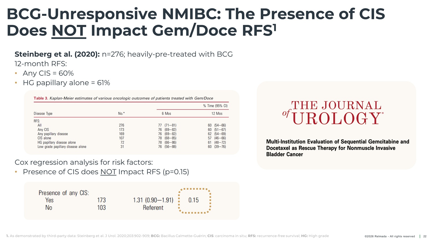 BCG - Unresponsive NMIBC: The Presence of CIS Does NOT Impact Gem/Doce RFS 1 Steinberg et al. (2020): n=276; heavily - pre - treated with BCG 12 - month RFS: • Any CIS = 60% • HG papillary alone = 61% Cox regression analysis for risk factors: • Presence of CIS does NOT Impact RFS (p=0.15) 1. As demonstrated by third - party data: Steinberg et al. J Urol. 2020;203:902 – 909; BCG: Bacillus Calmette - Guérin; CIS : carcinoma in situ; RFS: recurrence - free survival; HG: High grade ©2026 Relmada - All rights reserved 22