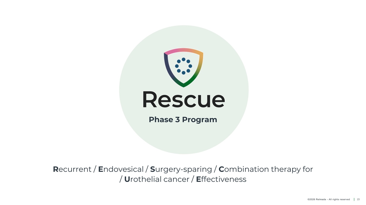 Phase 3 Program R ecurrent / E ndovesical / S urgery - sparing / C ombination therapy for / U rothelial cancer / E ffectiveness ©2026 Relmada - All rights reserved 23