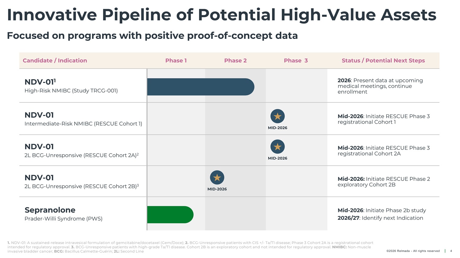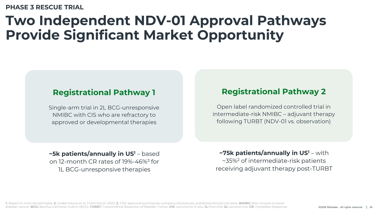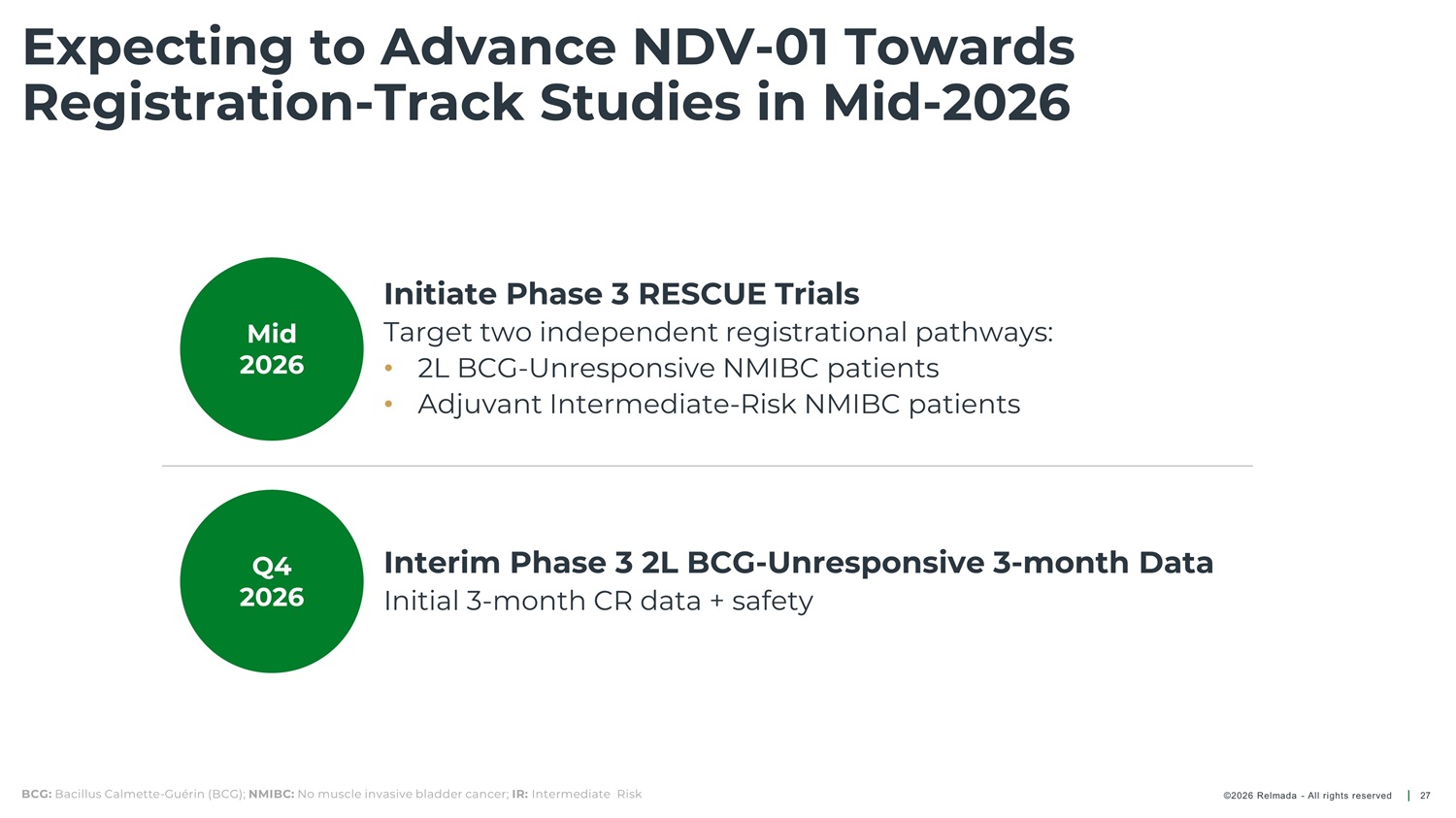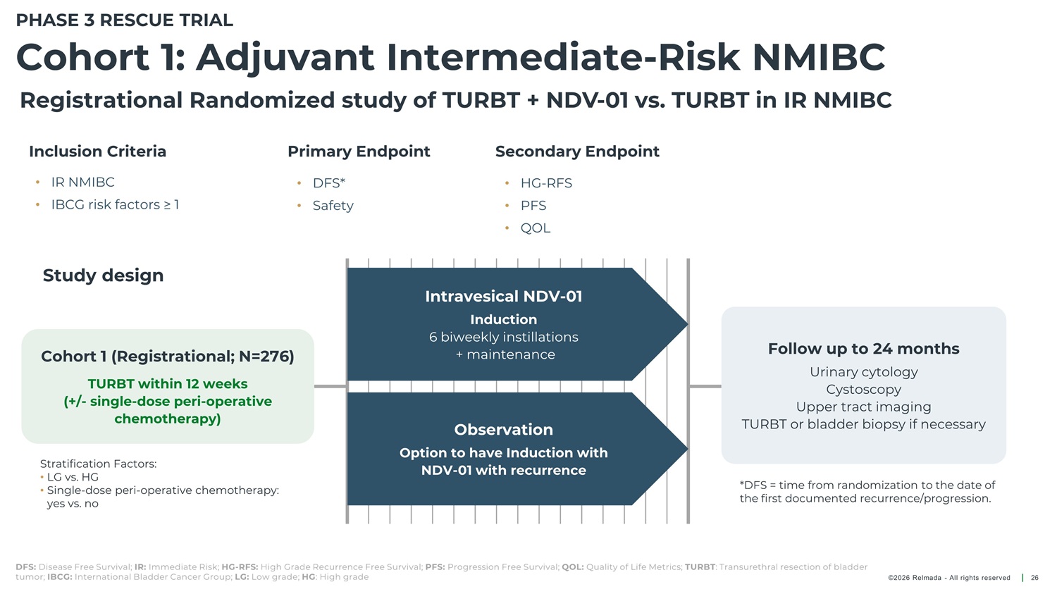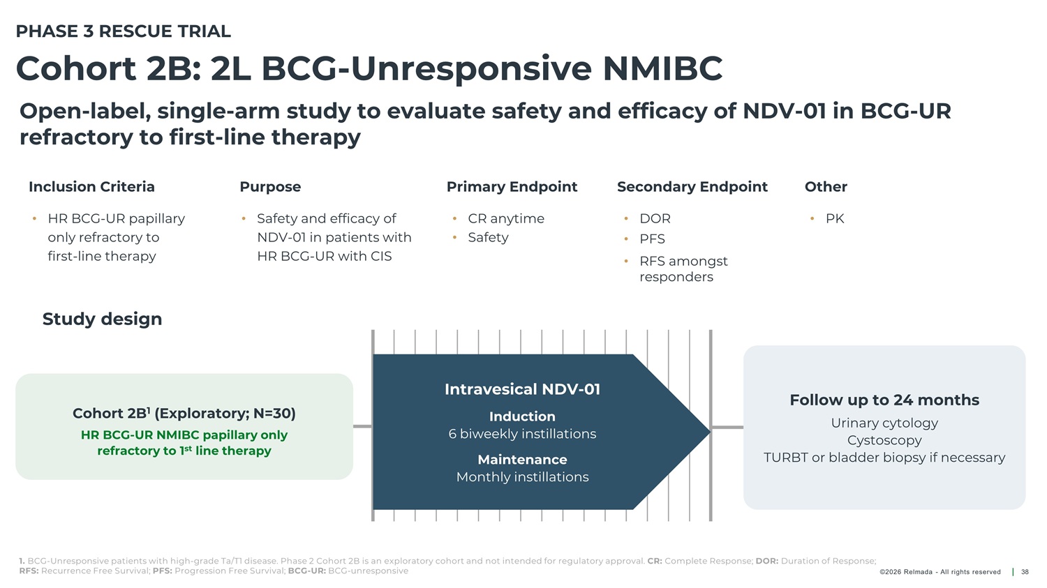 PHASE 3 RESCUE TRIAL Cohort 2A: 2L BCG - Unresponsive NMIBC Open - label, single - arm study to evaluate safety and efficacy of NDV - 01 in BCG - UR refractory to first - line therapy Inclusion Criteria Purpose Primary Endpoint Secondary Endpoint Other • HR BCG - UR with CIS refractory to first - line therapy • Safety and efficacy of NDV - 01 in patients with HR BCG - UR with CIS • CR anytime • Safety • DOR • PK • PFS • RFS amongst responders Study design Intravesical NDV - 01 Follow up to 24 months Cohort 2A 1 (Registrational; N=87) Induction 6 biweekly instillations Urinary cytology Cystoscopy TURBT or bladder biopsy if necessary HR BCG - UR NMIBC with CIS refractory to 1 st line therapy Maintenance Monthly instillations 1. BCG - Unresponsive patients with CIS +/ - Ta/T1 disease. Phase 3 Cohort 2A is a registrational cohort intended for regulatory approval. 2. BCG - Unresponsive patients with high - grade Ta/T1 disease. Phase 2 Cohort 2B is an exploratory cohort and not intended for regulatory approval. HR: High risk; CIS: Carcinoma In Situ; CR: Complete Response; DOR: Duration of Response; RFS: Recurrence Free Survival; PFS: Progression Free Survival; PK: Pharmacokinetics; TURBT: Transurethral resection of bladder tumor; BCG: Bacillus Calmette - Guérin BCG - UR: BCG - unresponsive ©2026 Relmada - All rights reserved 25