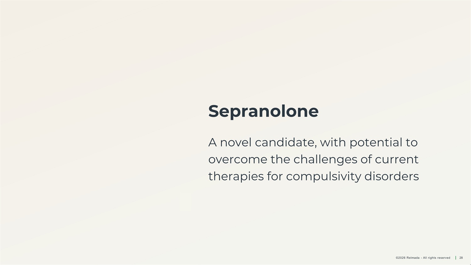 Sepranolone A novel candidate, with potential to overcome the challenges of current therapies for compulsivity disorders ©2026 Relmada - All rights reserved 28