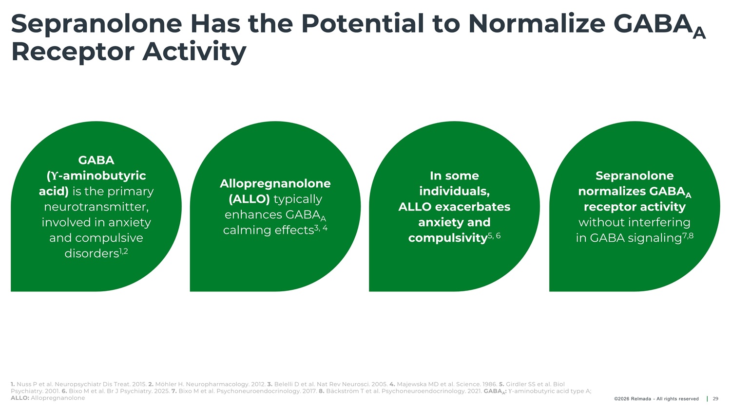 Sepranolone Has the Potential to Normalize GABA A Receptor Activity GABA ( Υ - aminobutyric acid) is the primary neurotransmitter, involved in anxiety and compulsive disorders 1,2 In some individuals, ALLO exacerbates anxiety and Sepranolone Allopregnanolone normalizes GABA A receptor activity without interfering in GABA signaling 7,8 (ALLO) typically enhances GABA calming effects 3, 4 A compulsivity 5, 6 1. Nuss P et al. Neuropsychiatr Dis Treat. 2015. 2. Möhler H. Neuropharmacology. 2012. 3. Belelli D et al. Nat Rev Neurosci. 2005. 4. Majewska MD et al. Science. 1986. 5. Girdler SS et al. Biol Psychiatry. 2001. 6. Bixo M et al. Br J Psychiatry. 2025. 7. Bixo M et al. Psychoneuroendocrinology. 2017. 8. Bäckström T et al. Psychoneuroendocrinology. 2021. GABA : Υ - aminobutyric acid type A; A ALLO: Allopregnanolone ©2026 Relmada - All rights reserved 29