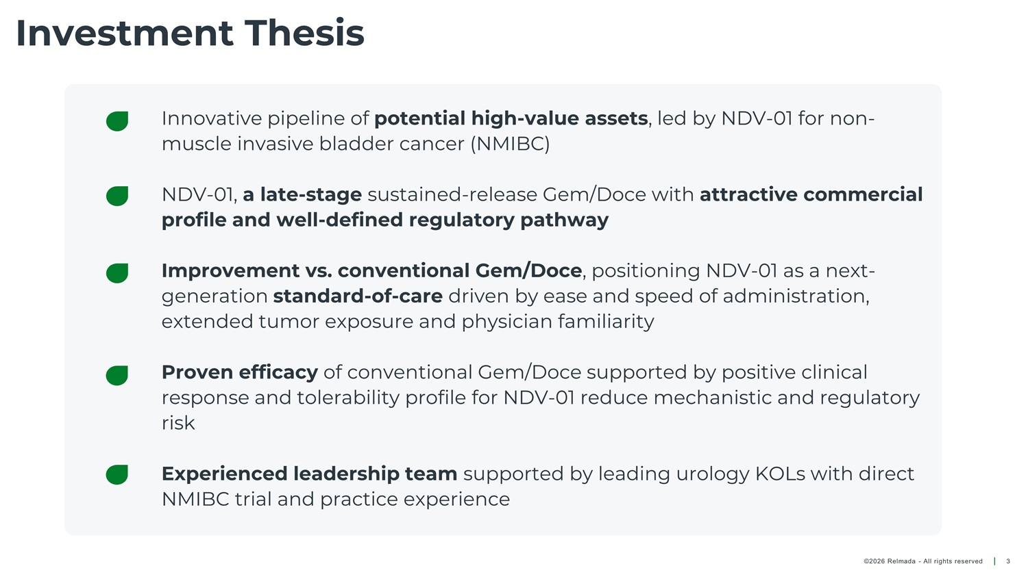 Investment Thesis Innovative pipeline of potential high - value assets , led by NDV - 01 for non - muscle invasive bladder cancer (NMIBC) NDV - 01, a late - stage sustained - release Gem/Doce with attractive commercial profile and well - defined regulatory pathway Improvement vs. conventional Gem/Doce , positioning NDV - 01 as a next - generation standard - of - care driven by ease and speed of administration, extended tumor exposure and physician familiarity Proven efficacy of conventional Gem/Doce supported by positive clinical response and tolerability profile for NDV - 01 reduce mechanistic and regulatory risk Experienced leadership team supported by leading urology KOLs with direct NMIBC trial and practice experience ©2026 Relmada - All rights reserved 3
