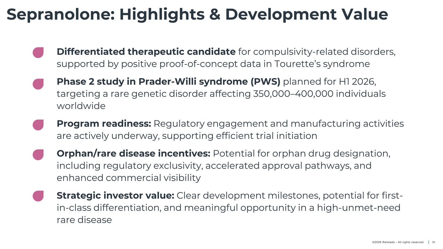 Positive Phase 2 Data and Unique MOA Give Sepranolone Broad Potential Neurological disorder characterized by repetitive, involuntary tics, with childhood onset Genetic disorder often defined by persistent hunger and overeating Prader - Willi Syndrome Tourette Syndrome Global prevalence 350 - 400K people 1 US prevalence 350 - 450K children and adults 3 Neurological disorder that causes involuntary, rhythmic shaking. Primarily notice during voluntary movements OCD is characterized by intrusive, unwanted thoughts (obsessions) and repetitive behaviors (compulsions) Obsessive - Compulsive Disorder and related Essential Tremors US prevalence 6.4 MM people 2 disorders US prevalence 8.2M people 4 1. Scheimann AO. UpToDate. 2023. 2. Crawford S et al. Neurology. 2020. 3. Tinker SC et al. Psychiatry Res. 2022. 4. International OCD Foundation epidemiology data. PWS: Prader - Willi syndrome; ET: Essential Tremor; OCD: Obsessive Compulsive Disorder ©2026 Relmada - All rights reserved 30