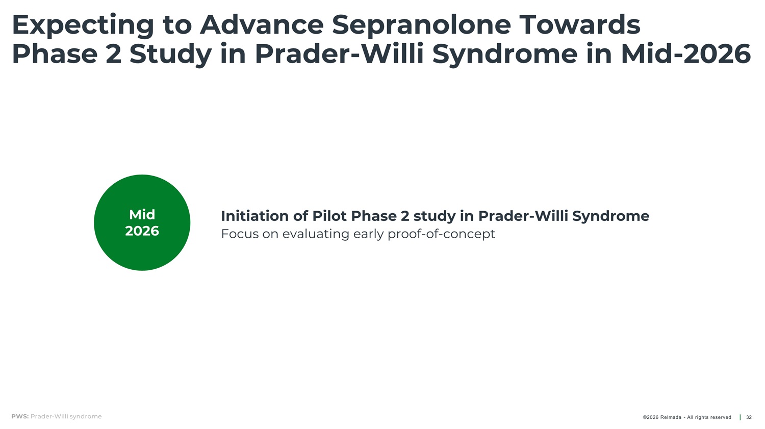 Sepranolone: Highlights & Development Value Differentiated therapeutic candidate for compulsivity - related disorders, supported by positive proof - of - concept data in Tourette’s syndrome Phase 2 study in Prader - Willi syndrome (PWS) planned for H1 2026, targeting a rare genetic disorder affecting 350,000 – 400,000 individuals worldwide Program readiness: Regulatory engagement and manufacturing activities are actively underway, supporting efficient trial initiation Orphan/rare disease incentives: Potential for orphan drug designation, including regulatory exclusivity, accelerated approval pathways, and enhanced commercial visibility Strategic investor value: Clear development milestones, potential for first - in - class differentiation, and meaningful opportunity in a high - unmet - need rare disease ©2026 Relmada - All rights reserved 31