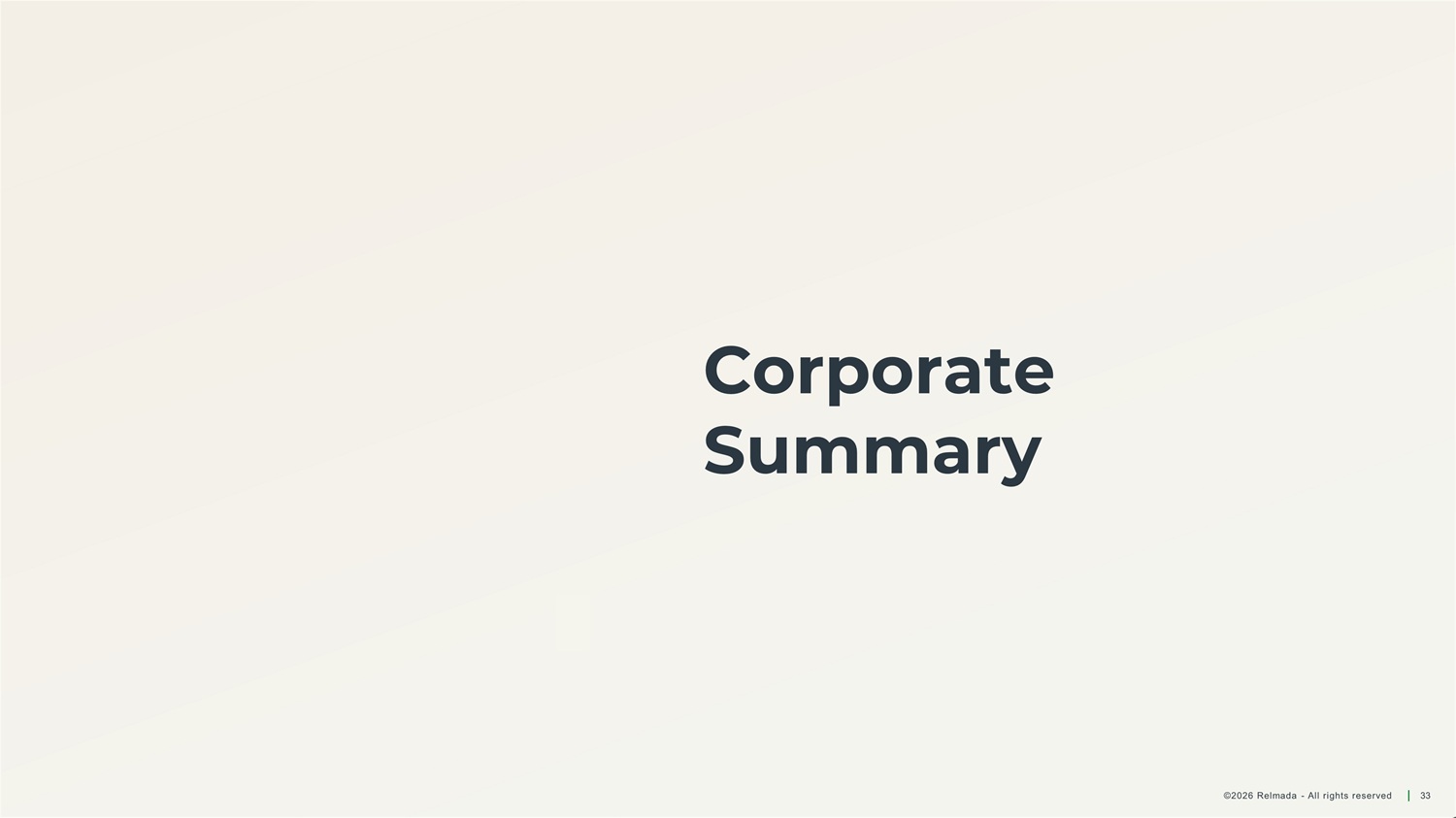 Corporate Summary ©2026 Relmada - All rights reserved 33