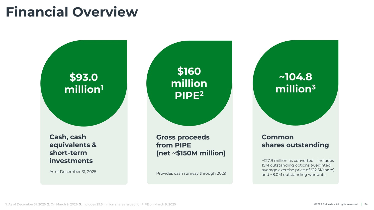 Financial Overview $160 million PIPE 2 $93.0 million ~104.8 million 3 1 Cash, cash Gross proceeds from PIPE Common equivalents & short - term investments shares outstanding (net ~$150M million) ~127.9 million as converted – includes 15M outstanding options (weighted average exercise price of $12.51/share) and ~8.0M outstanding warrants As of December 31, 2025 Provides cash runway through 2029 1. As of December 31, 2025; 2. On March 9, 2026; 3. Includes 29.5 million shares issued for PIPE on March 9, 2025 34 ©2026 Relmada - All rights reserved