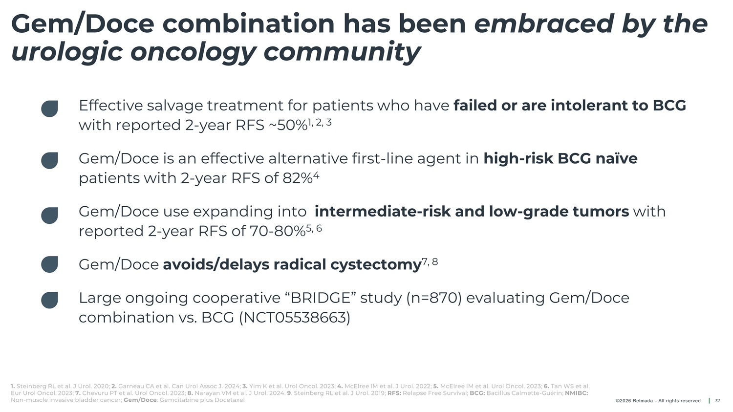 Gem/Doce combination has been embraced by the urologic oncology community Effective salvage treatment for patients who have failed or are intolerant to BCG with reported 2 - year RFS ~50% 1, 2, 3 Gem/Doce is an effective alternative first - line agent in high - risk BCG naïve patients with 2 - year RFS of 82% 4 Gem/Doce use expanding into intermediate - risk and low - grade tumors with reported 2 - year RFS of 70 - 80% 5, 6 Gem/Doce avoids/delays radical cystectomy 7, 8 Large ongoing cooperative “BRIDGE” study (n=870) evaluating Gem/Doce combination vs. BCG (NCT05538663) 1. Steinberg RL et al. J Urol. 2020; 2. Garneau CA et al. Can Urol Assoc J. 2024; 3. Yim K et al. Urol Oncol. 2023; 4. McElree IM et al. J Urol. 2022; 5. McElree IM et al. Urol Oncol. 2023; 6. Tan WS et al. Eur Urol Oncol. 2023; 7. Chevuru PT et al. Urol Oncol. 2023; 8. Narayan VM et al. J Urol. 2024. 9 . Steinberg RL et al. J Urol. 2019; RFS: Relapse Free Survival; BCG: Bacillus Calmette - Guérin; NMIBC: Non - muscle invasive bladder cancer; Gem/Doce : Gemcitabine plus Docetaxel ©2026 Relmada - All rights reserved 37