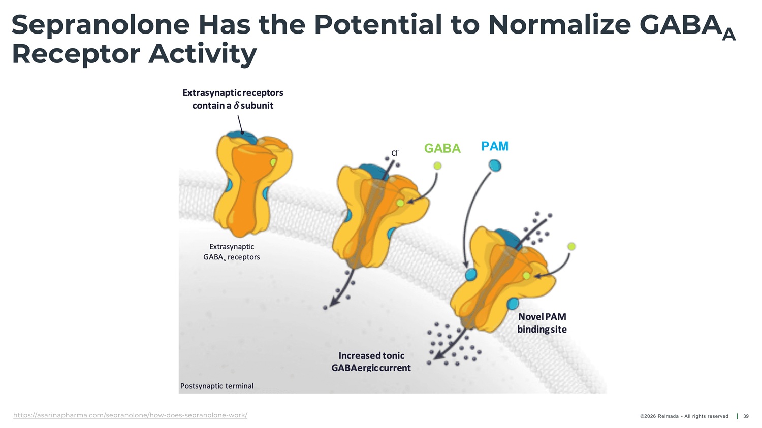Sepranolone Has the Potential to Normalize GABA A Receptor Activity PAM GABA https://asarinapharma.com/sepranolone/how - does - sepranolone - work/ ©2026 Relmada - All rights reserved 39