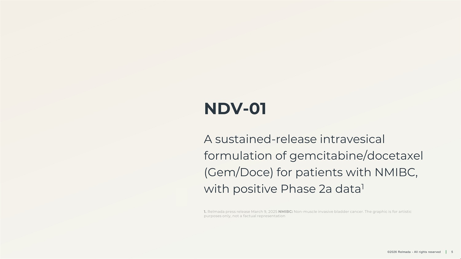 Innovative Pipeline of Potential High - Value Assets Focused on programs with positive proof - of - concept data Candidate / Indication Phase 1 Phase 2 Phase 3 Status / Potential Next Steps NDV - 01 1 High - Risk NMIBC (Study TRCG - 001) 2026 : Present data at upcoming medical meetings, continue enrollment NDV - 01 Mid - 2026 : Initiate RESCUE Phase 3 registrational Cohort 1 Intermediate - Risk NMIBC (RESCUE Cohort 1) MID - 2026 NDV - 01 2L BCG - Unresponsive (RESCUE Cohort 2A) 2 Mid - 2026 : Initiate RESCUE Phase 3 registrational Cohort 2A MID - 2026 NDV - 01 2L BCG - Unresponsive (RESCUE Cohort 2B) 3 Mid - 2026: Initiate RESCUE Phase 2 exploratory Cohort 2B MID - 2026 Sepranolone Prader - Willi Syndrome (PWS) Mid - 2026 : Initiate Phase 2b study 2026/27 : Identify next Indication 1. NDV - 01: A sustained - release intravesical formulation of gemcitabine/docetaxel (Gem/Doce); 2. BCG - Unresponsive patients with CIS +/ - Ta/T1 disease; Phase 3 Cohort 2A is a registrational cohort intended for regulatory approval. 3. BCG - Unresponsive patients with high - grade Ta/T1 disease. Cohort 2B is an exploratory cohort and not intended for regulatory approval. NMIBC: Non - muscle invasive bladder cancer; BCG: Bacillus Calmette - Guérin; 2L: Second Line ©2026 Relmada - All rights reserved 4