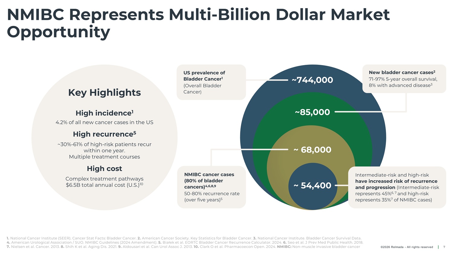 Our Focus: Non - Muscle Invasive Bladder Cancer (NMIBC) 80% 20% of new cases 1,2 of new cases 1,2 Non - muscle invasive Muscle - invasive NMIBC MIBC • Tumors have invaded bladder muscle with or • Papillary tumors: non - invasive without lymph node involvement projections from the bladder surface • Tumors may have spread to nearby organs but are • Carcinoma in situ (CIS): flat, aggressive not growing into the pelvic or abdominal wall cancer that is often unresectable 1. Shih K et al. Aging Dis. 2021. 2. Aldousari S et al. Can Urol Assoc J. 2013. ©2026 Relmada - All rights reserved 6