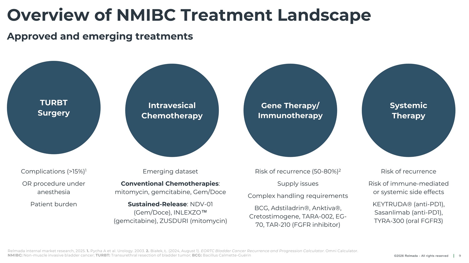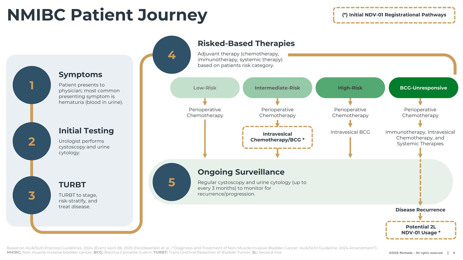 NMIBC Patient Journey (*) Initial NDV - 01 Registrational Pathways Risked - Based Therapies 4 Adjuvant therapy (chemotherapy, immunotherapy, systemic therapy) based on patients risk category. Symptoms 1 Patient presents to Low - Risk Intermediate - Risk High - Risk BCG - Unresponsive physician; most common presenting symptom is hematuria (blood in urine). Perioperative Chemotherapy Perioperative Chemotherapy Perioperative Chemotherapy Perioperative Chemotherapy Initial Testing Intravesical BCG Immunotherapy, Intravesical Chemotherapy, and Intravesical 2 3 Chemotherapy/BCG * Urologist performs cystoscopy and urine cytology. Systemic Therapies Ongoing Surveillance 5 TURBT Regular cystoscopy and urine cytology (up to every 3 months) to monitor for recurrence/progression. TURBT to stage, risk - stratify, and treat disease. Disease Recurrence Potential 2L NDV - 01 Usage * Based on AUA/SUO Practice Guidelines, 2024 (Event April 28, 2025 (Holzbeierlein et al. (“Diagnosis and Treatment of Non - Muscle Invasive Bladder Cancer: AUA/SUO Guideline: 2024 Amendment”). NMIBC: Non - muscle invasive bladder cancer; BCG: Bacillus Calmette Guérin; TURBT: Trans Urethral Resection of Bladder Tumor; 2L: Second - line ©2026 Relmada - All rights reserved 8