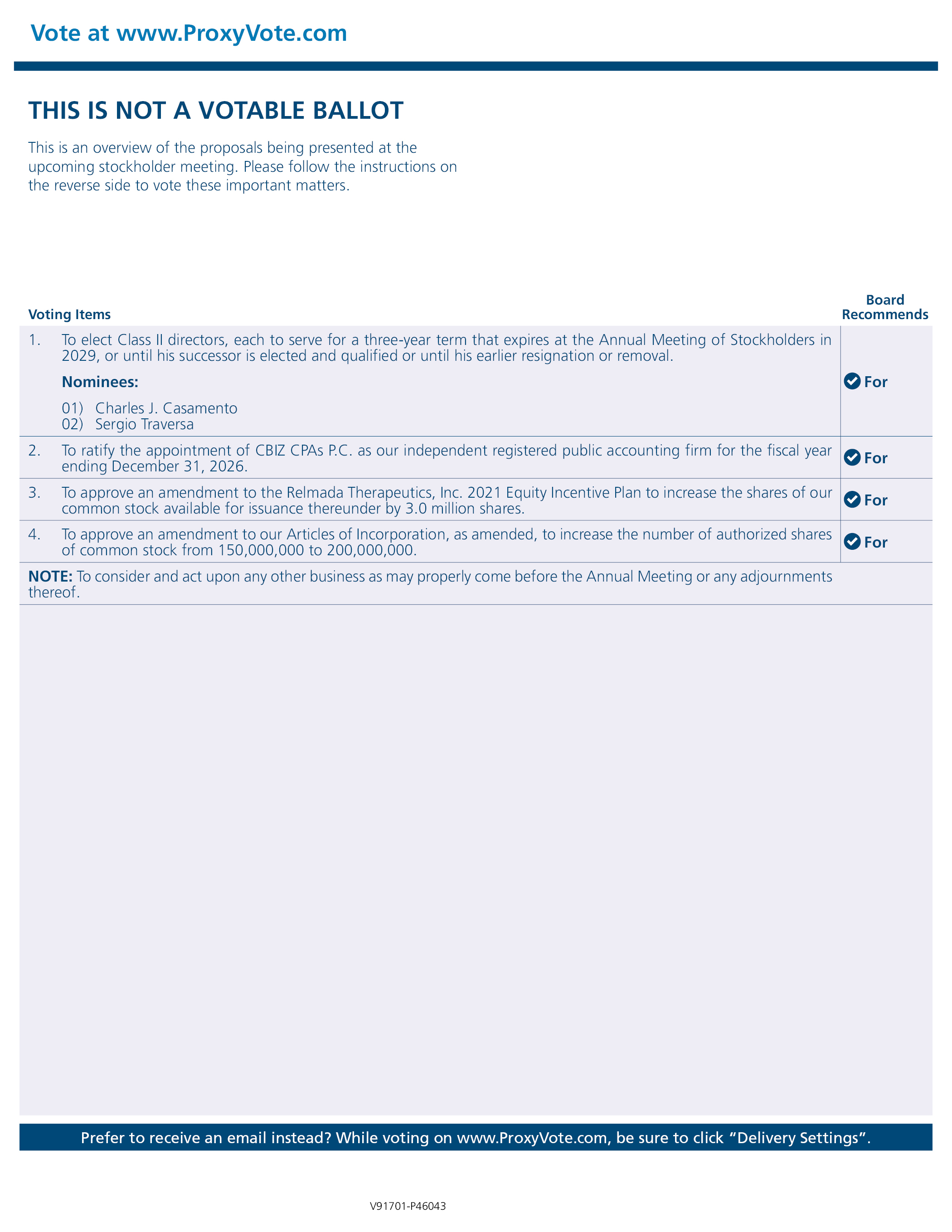 Vote at www.ProxyVote.com THIS IS NOT A VOTABLE BALLOT This is an overview of the proposals being presented at the upcoming stockholder meeting. Please follow the instructions on the reverse side to vote these important matters. Voting Items Board Recommends 1.To elect Class II directors, each to serve for a three-year term that expires at the Annual Meeting of Stockholders in 2029, or until his successor is elected and qualified or until his earlier resignation or removal. Nominees: 01) Charles J. Casamento 02) Sergio Traversa 2. To ratify the appointment of CBIZ CPAs P.C. as our independent registered public accounting firm for the fiscal year ending December 31, 2026. 3. To approve an amendment to the Relmada Therapeutics, Inc. 2021 Equity Incentive Plan to increase the shares of our common stock available for issuance thereunder by 3.0 million shares. 4. To approve an amendment to our Articles of Incorporation, as amended, to increase the number of authorized shares of common stock from 150,000,000 to 200,000,000. NOTE: To consider and act upon any other business as may properly come before the Annual Meeting or any adjournments thereof. For Prefer to receive an email instead? While voting on www.ProxyVote.com, be sure to click “Delivery Settings”. V91701-P46043